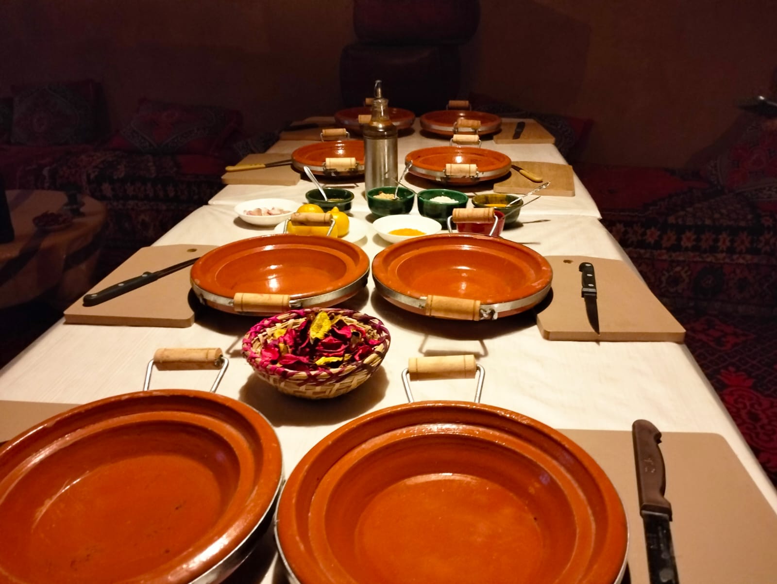 COURS DE CUISINE Au Maroc ,nos ingrédients sont souvent très peu utilisés en Europe. C'est pourquoi nous vous proposons des cours de cuisine pour diversifier vos entrées, plats, desserts et leur donner des saveurs subtiles. Vous découvrirez la farine de blé dur dans les Baghrirs,les citrons confits dans le tajine,la cannelle dans les gâteaux,le cumin dans la harira. La fleur d'oranger,les amandes et le safran vous surprendront là où vous ne les attendez pas. Le chef vous révélera comment respecter les temps de cuisson des ingrédients et comment doser l'équilibre entre les saveurs sucrées et salées. Ainsi vous serez capables de prolonger votre voyage dès votre retour à la maison...